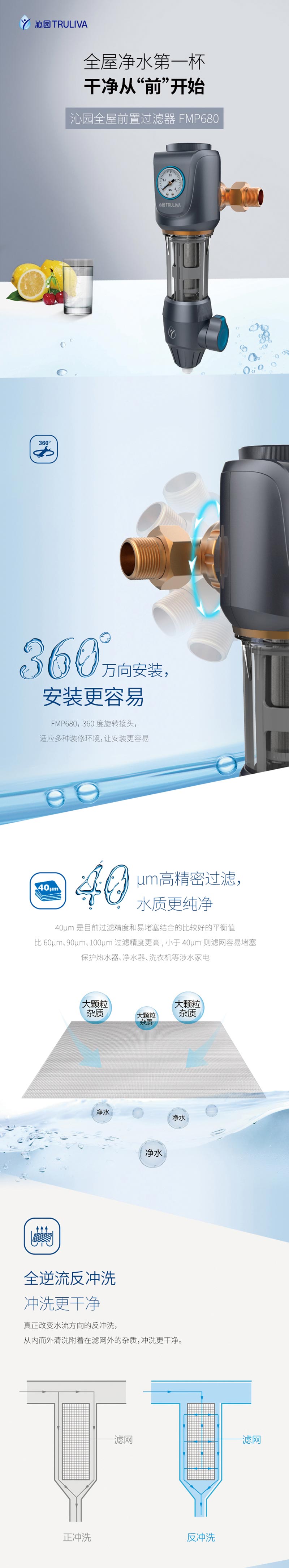 前置过滤器是对全屋用水的第一道粗过滤设备,可以过滤自来水中的泥沙、铁锈等大颗粒物质。前置过滤器一般安装在管道的前端,所以以“前置”二字来命名;而“过滤”,则指的是这类设备的基本原理。通常为“T”型结构。上面的“一横”的位置左右两端分别为进出水口。下面的“一竖”位置为机身和内部的筒形过滤网,最下端则为排污口,靠一个阀门来控制开启和关闭。滤网的精度范围根据不同品牌和型号从5-300微米不等。主要的去除管道所产生的沉淀杂质和细菌、微生物残骸、铁锈、沙泥等大于5微米以上的颗粒杂质,避免人体及肌肤受到伤害;并且对下游管道、净水器、热水器、洗衣机、高档的龙头、花洒起到积极的保护作用,前置过滤器还可以添加“盐酸复磷”阻垢滤芯对太阳能、开水器起到阻垢的作用。通常安装在进水管道水表后,以确保管网中产生的大量沉淀杂质不会对人体造成伤害,并且对暗敷管道、水龙头、电器等起到积极的保护作用,是一种可靠的杂质过滤装置。
