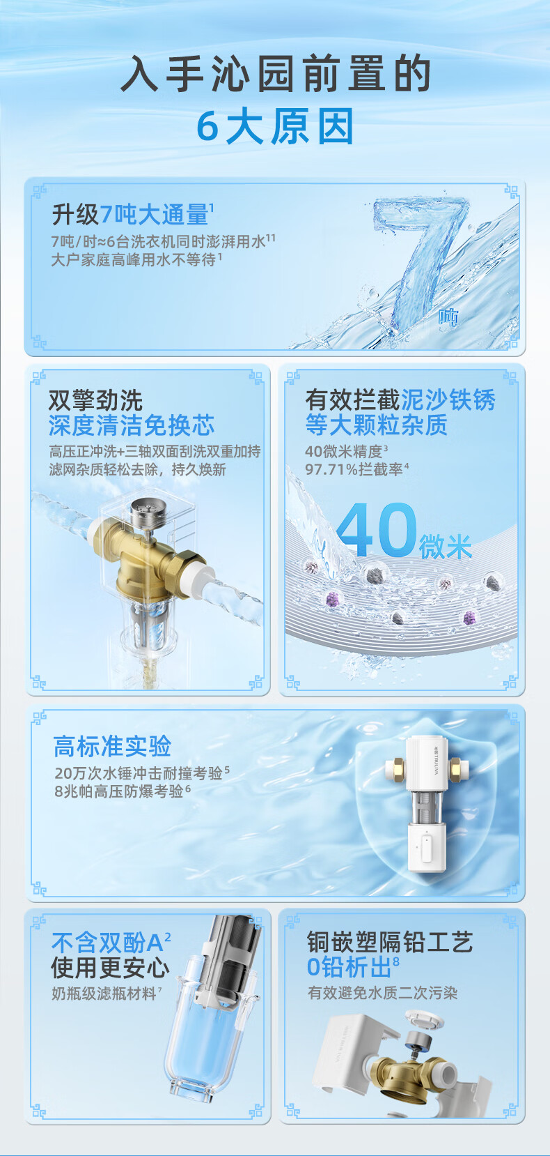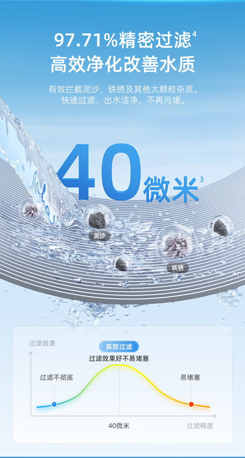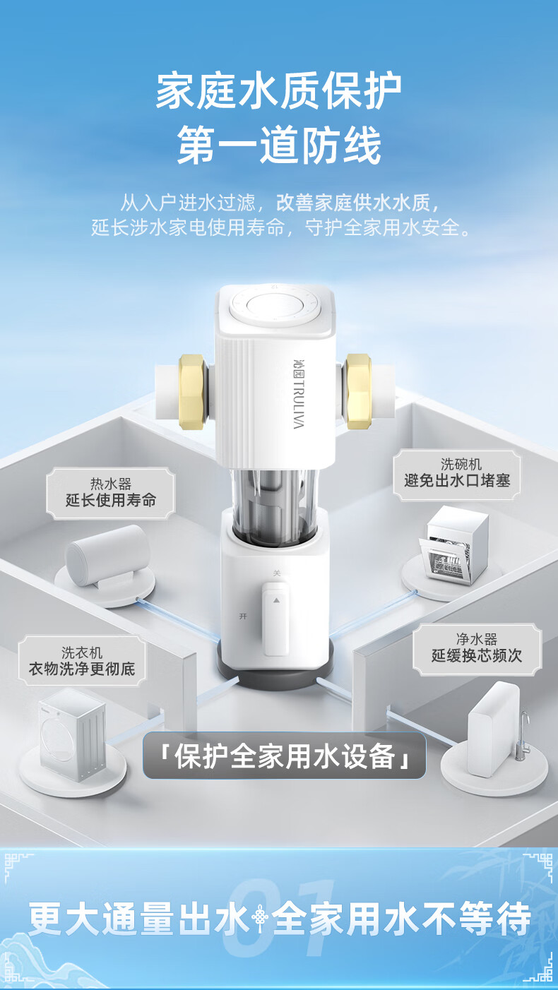 前置过滤器是对全屋用水的第一道粗过滤设备,可以过滤自来水中的泥沙、铁锈等大颗粒物质。前置过滤器一般安装在管道的前端,所以以“前置”二字来命名;而“过滤”,则指的是这类设备的基本原理。通常为“T”型结构。上面的“一横”的位置左右两端分别为进出水口。下面的“一竖”位置为机身和内部的筒形过滤网,最下端则为排污口,靠一个阀门来控制开启和关闭。滤网的精度范围根据不同品牌和型号从5-300微米不等。主要的去除管道所产生的沉淀杂质和细菌、微生物残骸、铁锈、沙泥等大于5微米以上的颗粒杂质,避免人体及肌肤受到伤害;并且对下游管道、净水器、热水器、洗衣机、高档的龙头、花洒起到积极的保护作用,前置过滤器还可以添加“盐酸复磷”阻垢滤芯对太阳能、开水器起到阻垢的作用。通常安装在进水管道水表后,以确保管网中产生的大量沉淀杂质不会对人体造成伤害,并且对暗敷管道、水龙头、电器等起到积极的保护作用,是一种可靠的杂质过滤装置。