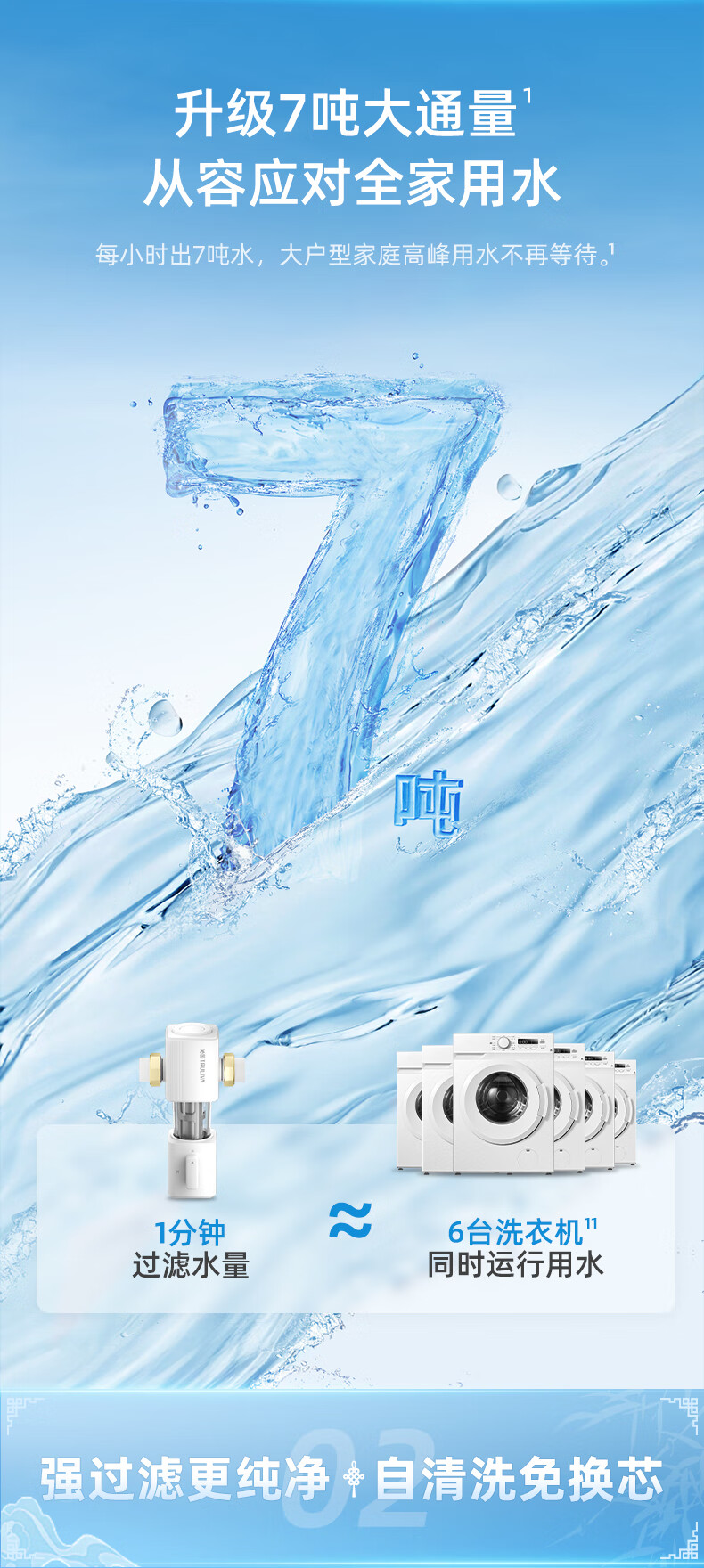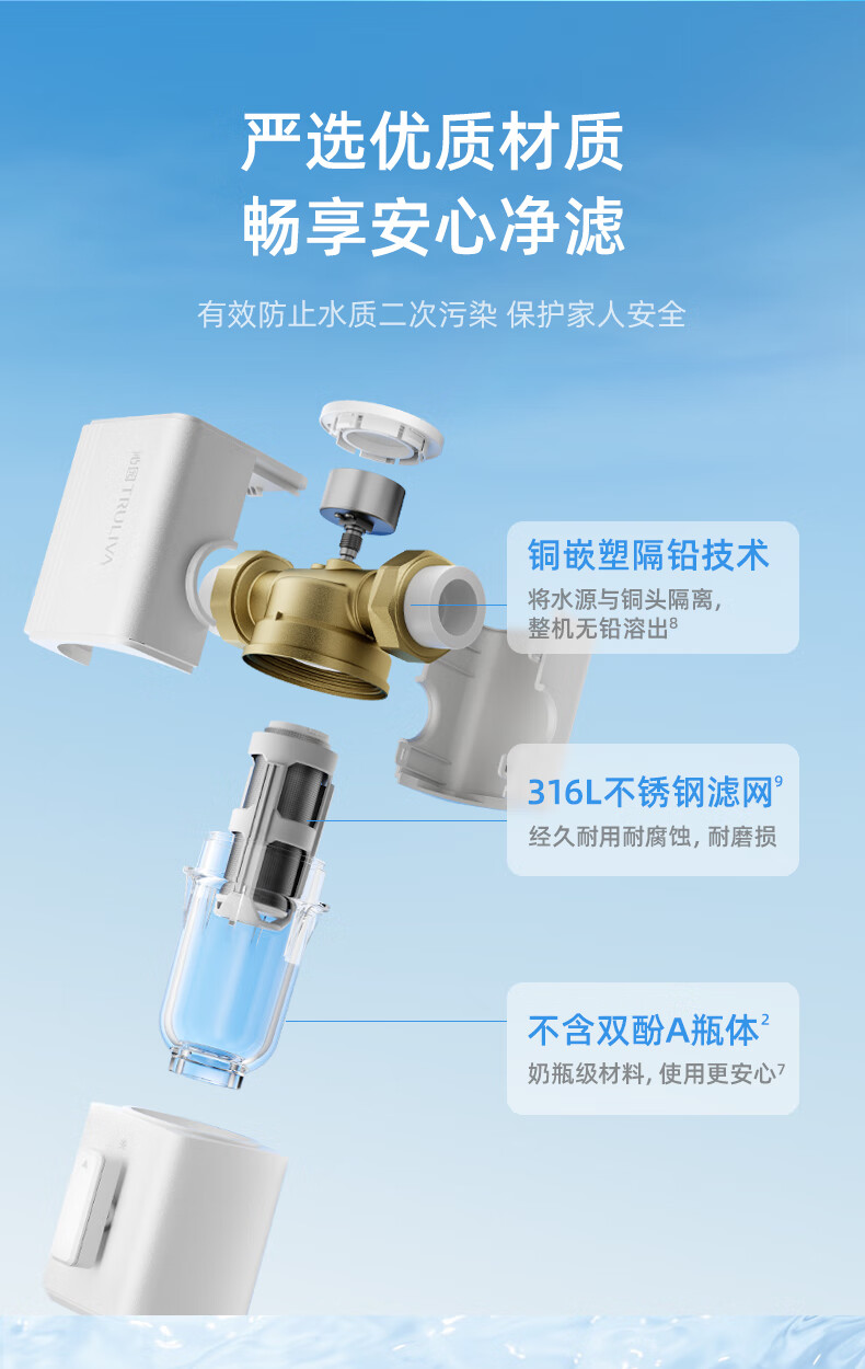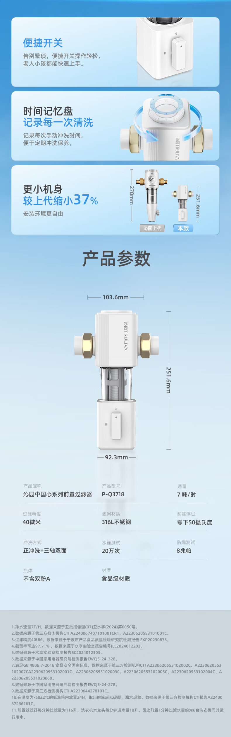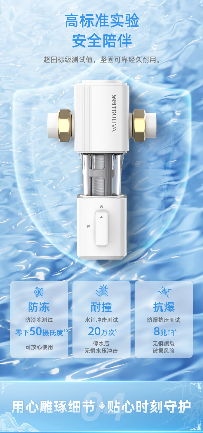 前置过滤器是对全屋用水的第一道粗过滤设备,可以过滤自来水中的泥沙、铁锈等大颗粒物质。前置过滤器一般安装在管道的前端,所以以“前置”二字来命名;而“过滤”,则指的是这类设备的基本原理。通常为“T”型结构。上面的“一横”的位置左右两端分别为进出水口。下面的“一竖”位置为机身和内部的筒形过滤网,最下端则为排污口,靠一个阀门来控制开启和关闭。滤网的精度范围根据不同品牌和型号从5-300微米不等。主要的去除管道所产生的沉淀杂质和细菌、微生物残骸、铁锈、沙泥等大于5微米以上的颗粒杂质,避免人体及肌肤受到伤害;并且对下游管道、净水器、热水器、洗衣机、高档的龙头、花洒起到积极的保护作用,前置过滤器还可以添加“盐酸复磷”阻垢滤芯对太阳能、开水器起到阻垢的作用。通常安装在进水管道水表后,以确保管网中产生的大量沉淀杂质不会对人体造成伤害,并且对暗敷管道、水龙头、电器等起到积极的保护作用,是一种可靠的杂质过滤装置。