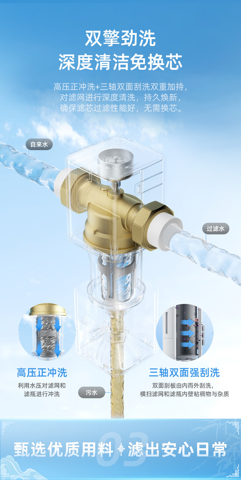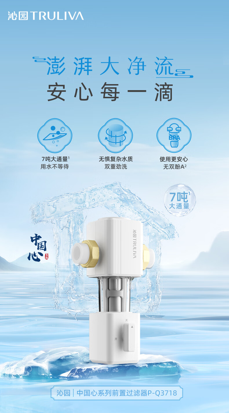 前置过滤器是对全屋用水的第一道粗过滤设备,可以过滤自来水中的泥沙、铁锈等大颗粒物质。前置过滤器一般安装在管道的前端,所以以“前置”二字来命名;而“过滤”,则指的是这类设备的基本原理。通常为“T”型结构。上面的“一横”的位置左右两端分别为进出水口。下面的“一竖”位置为机身和内部的筒形过滤网,最下端则为排污口,靠一个阀门来控制开启和关闭。滤网的精度范围根据不同品牌和型号从5-300微米不等。主要的去除管道所产生的沉淀杂质和细菌、微生物残骸、铁锈、沙泥等大于5微米以上的颗粒杂质,避免人体及肌肤受到伤害;并且对下游管道、净水器、热水器、洗衣机、高档的龙头、花洒起到积极的保护作用,前置过滤器还可以添加“盐酸复磷”阻垢滤芯对太阳能、开水器起到阻垢的作用。通常安装在进水管道水表后,以确保管网中产生的大量沉淀杂质不会对人体造成伤害,并且对暗敷管道、水龙头、电器等起到积极的保护作用,是一种可靠的杂质过滤装置。